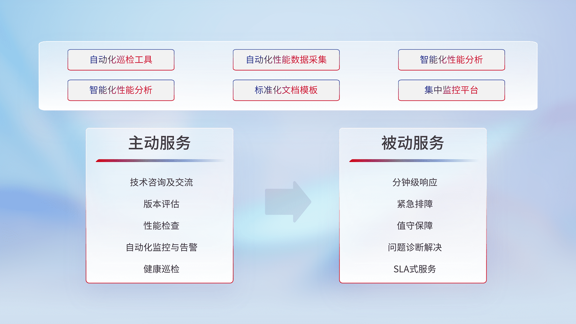 智能化工具和标准化文档,,保障服务质量,,,,提供主动服务(包含技术咨询、、、版本评估、、、性能检查、、、自动化监控与告警、、、健康巡检)和被动服务包含(分钟级响应、、紧急排障、、、值守保障、、、问题诊断解决、、SLA服务)。。